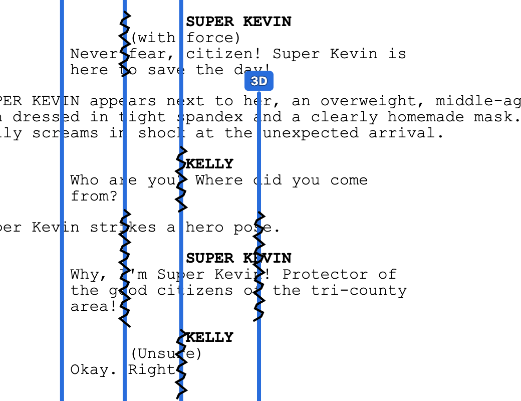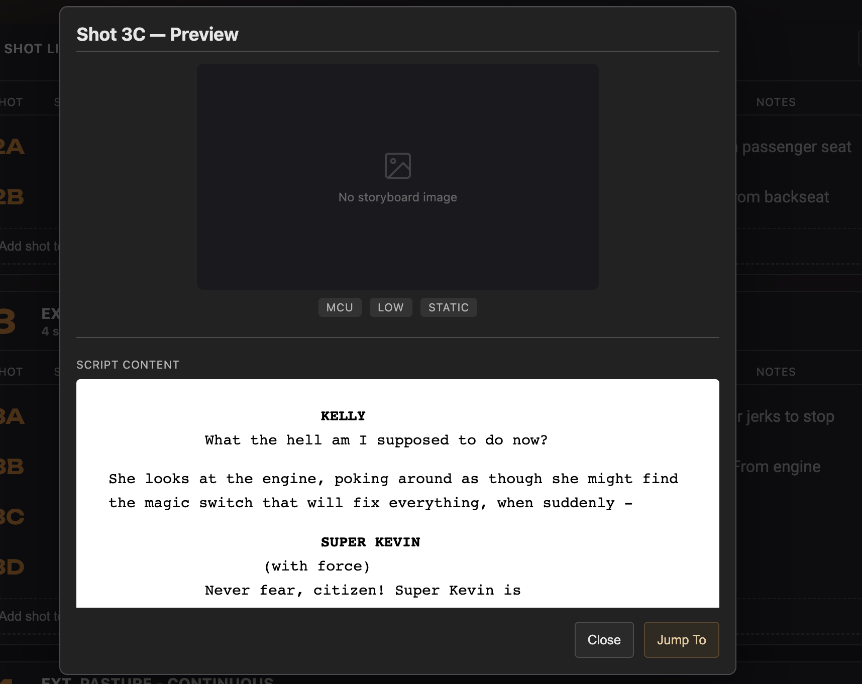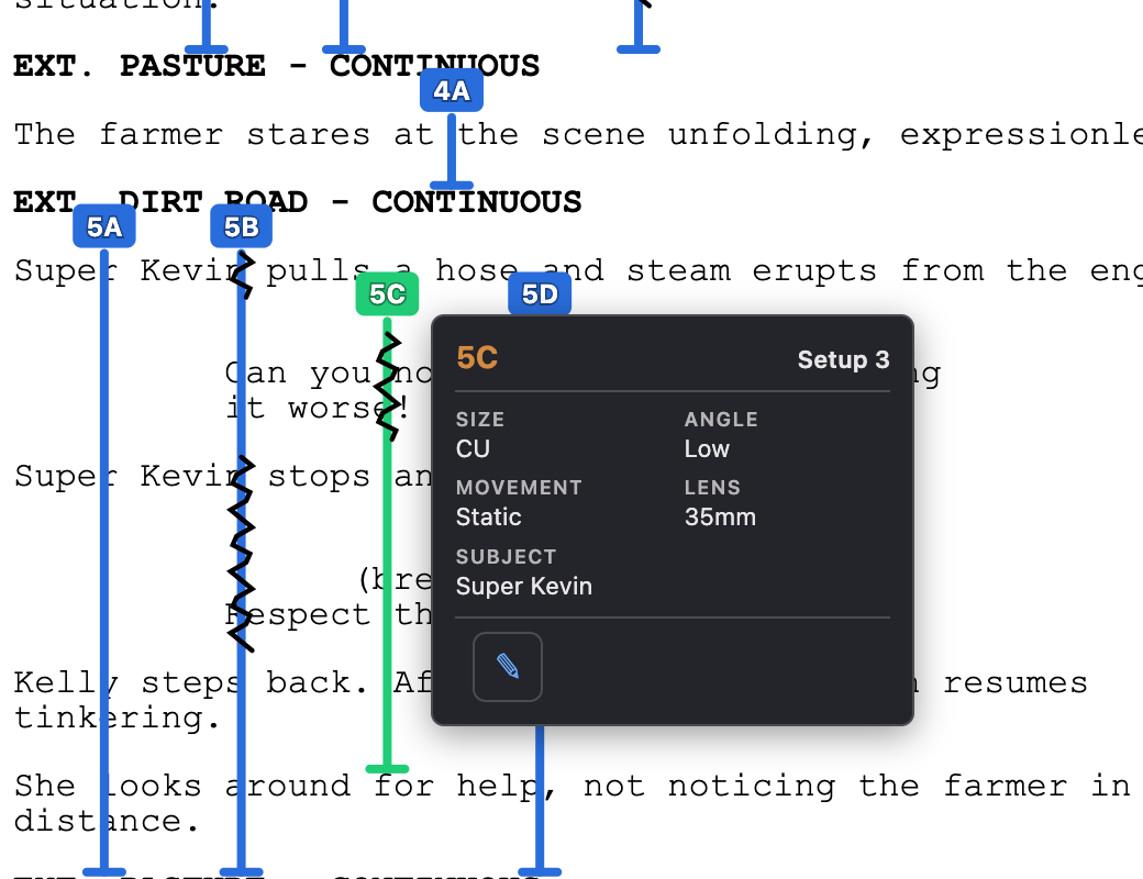 Mark off-screen dialogue with squiggles on the line. Each shot's details are viewable and editable from a popover right on the page.