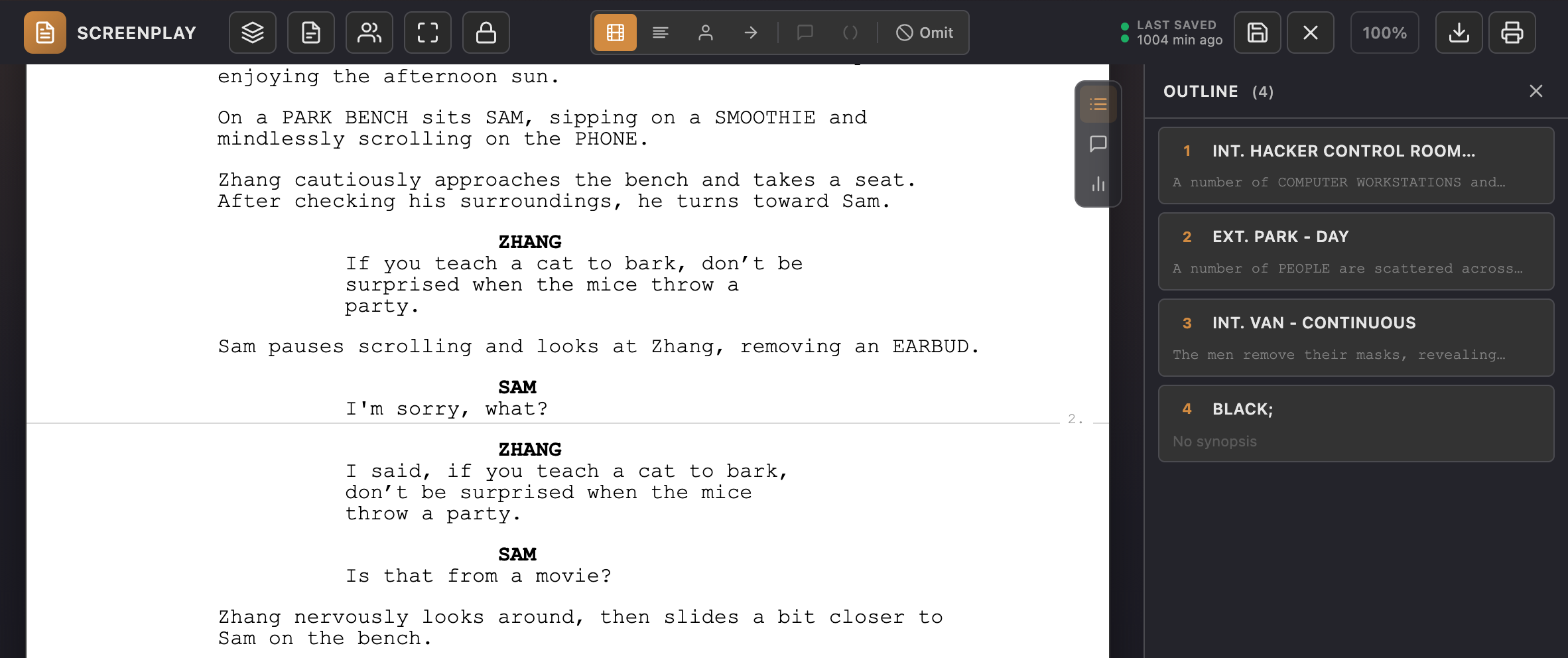 Character names and scene headings auto-suggest as you type, keeping your script consistent and saving keystrokes on recurring elements.