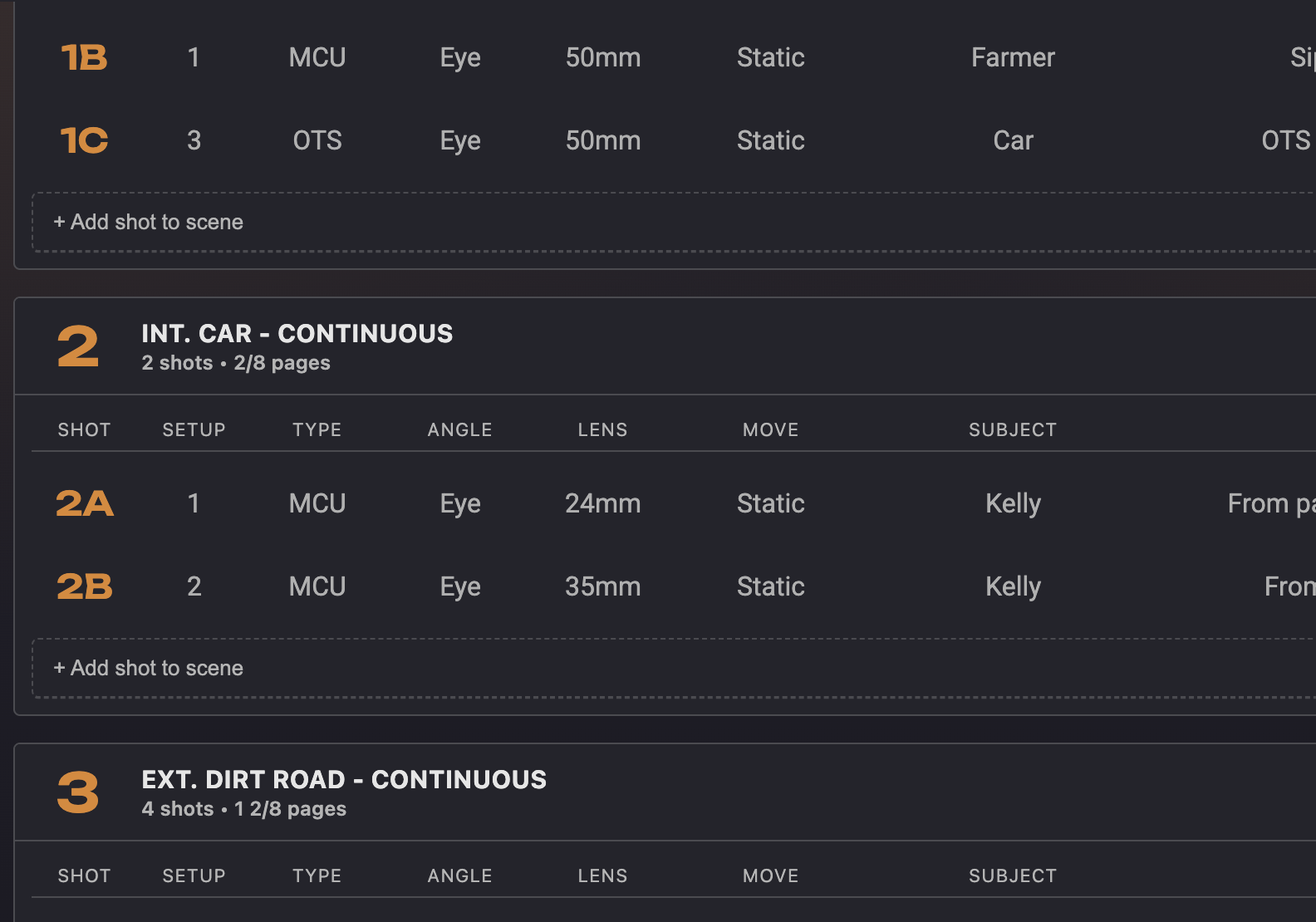 Navigate scene by scene and break down each one. Scene headings, cast, and page counts are pulled directly from the screenplay; no re-typing.